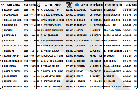 - -FAKIR DE MAHEY: Après plusieurs prestations en demi-teinte, ce sujet dur à l’effort vient de se réhabiliter à Bordeaux, dans un Groupe 3 bien composé (3e). Il possède des références sur la grande piste de Vincennes et partira avec la confiance de son mentor. A retenir en haut rang.