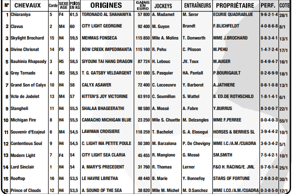 16 -PRINCE OF CLOUDS: Plaisant deuxième de l’événement du 25 mars au Val d’Or, il n’a pu fournir sa valeur ensuite à Bordeaux (12e) et ne doit pas être condamné là-dessus. Même si la moyenne piste ne va sans doute pas l’avantager, il ne peut être ignoré à l’heure du choix.