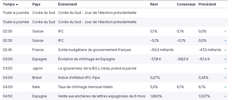 Cette nuit et ce matin en Asie, les indices traitent tous dans le vert. Tokyo gagne 0,8% à la cloche, Hong Kong avance de 0,46%, Shanghai progresse de 0,42%, Séoul bondit de 2,66% après l’élection présidentielle et le Nifty50 avance de 0,31%. Le future SPX est à l’équilibre et l’Europe ouvre en hausse de 0,5%. L’or reste demandé, l’once remonte à 3360$.