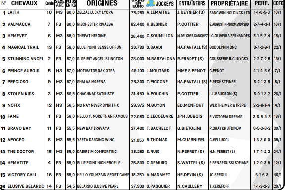 Aguerri sur le sable, NOFIX (9) a réussi sa transition sur le gazon. Pour son premier essai dans un Quinté+, il a conclu dans une belle action à la deuxième place. Certes, la lauréate était intouchable ce jour-là. Mais nul doute que l’élève d’Edouart Monfort ne sera pas loin de la vérité cette fois. En pleine ascension, HEMATITE (14) n’est pas mal située en bas de tableau et peut se révéler dès sa première apparition dans cette catégorie. Pénalisé de quatre kilos suite à son succès du 24 avril à ce niveau, LAITH (1) tient toujours la super forme et peut se surpasser. Sur la ligne de notre préféré, PRINCE AUBOIS (6), bien placé dans les stalles de départ ce coup-ci, et PRECIOSO (7), pas très heureux ce jour-là, sont des choix logiques. STUNNING ANGEL (5), qui va attendre, ELUSIVE BELARDO (16), récente réclamation de Nicolas Caullery, et HEMEVEZ (3), Mauricio Delcher-Sanchez a de bonnes “lignes” avec ses 3 ans, complètent notre choix.