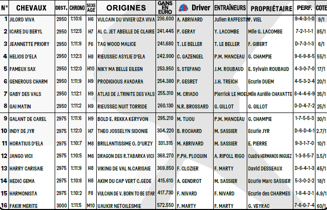 11 -HORATIUS D’ELA: Sagement mené dans la cinquième étape au Croisé-Laroche, il a fourni un très bel effort final au second plan (9e). Il possède de solides références à main droite (cinq podiums en sept essais) et sera cette fois associé à Matthieu Abrivard. À surveiller de près.