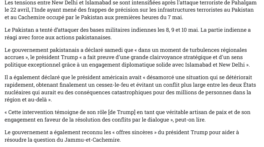 Le Pakistan a nommé le président américain Donald Trump pour le prix Nobel de la paix 2026 « en reconnaissance de son intervention diplomatique décisive et de son leadership essentiel lors de la récente crise indo- pakistanaise ».