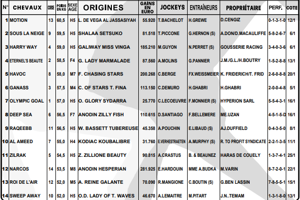 3 -HARRY WAY: Quatrième pour son retour dans les handicaps, ce représentant de Gousserie Racing a depuis confirmé son retour en forme en se classant troisième du Grand Handicap de Lamorlaye, juste derrière GANASS (6). À nouveau confié à Maxime Guyon, il devrait lutter pour les premières places. Podium en vue !