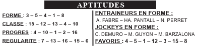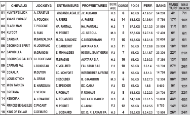 Lors de ses dernières tentatives, KLYCOT (4) a été vu dans des lots bien composés et semble bien placé, en valeur 37, pour son premier handicap. Confirmé sur cette distance, il pourrait bien mettre tout le monde d’accord. CARISHA (5) avait montré un certain potentiel à 2 ans et reste sur une plaisante victoire, notamment devant Gerard Ter Borch, deuxième de Quinté+ depuis. Malgré la corde 15, elle conduira l’opposition en compagnie de HUNTER’S LUCK (1), qui reste sur une performance honorable dans la Coupe des 3 Ans à Lyon-Parilly, de MISS TARKEN (12), sur la montante, et de FLASH MAN (3), irréprochable depuis plusieurs mois. À 2 ans, PRINCESSE GALILEE (15) avait prouvé qu’elle possédait quelques moyens et vient de réaliser une rentrée encourageante dans un handicap. Elle devrait progresser sur cette sortie et s’annonce compétitive pour les places, à l’instar de DSCHINGIS GALILEI (8), récent lauréat, notamment face à FLASH MAN