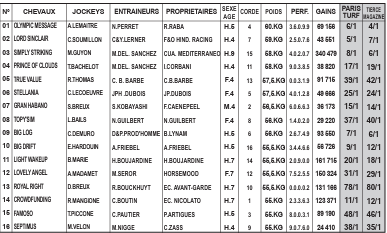 14. CROWDFUNDING: Arrivé dans l’effectif de Cédric Boutin début avril, il se montre très régulier depuis. Il vient de bien tenir sa partie sur ce parcours (2e) mais devra faire encore mieux pour briller en pareille société. À envisager plutôt pour la quatrième ou cinquième place.