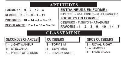 11. LIGHT WAKEUP: Cet élève d’Helmi Boujardine vient de mettre fin à une série d’échecs au Lion-d’Angers (2e ex-aequo). Il a retrouvé une valeur attractive et le port des œillères lui a probablement donné un coup de boost. Une possibilité parmi d’autres pour les places.