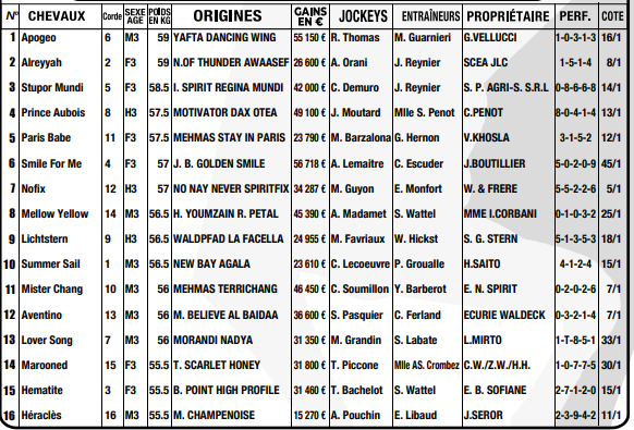 14. MAROONED: Cette fille de Toronado a surpris son mentor récemment en s’imposant à Compiègne. Elle doit composer avec trois kilos de surcharge, mais aurait sans doute préféré une piste plus souple. Malgré ses progrès, d’autres protagonistes offrent davantage de garanties.