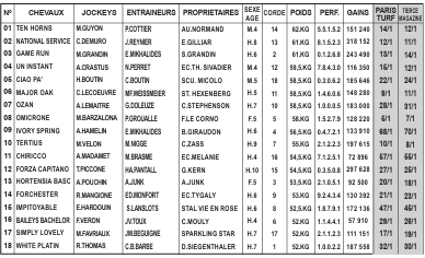 1.TEN HORNS: Quatrième du Prix Kistena (Listed pour 3 ans) sur ce parcours il y a un an, ce protégé de Patrice Cottier retrouve une distance qu’il adore après avoir tenté sa chance sur le mile vichyssois (5e). Il est compétitif à cette valeur et fait logiquement partie des candidats au podium.