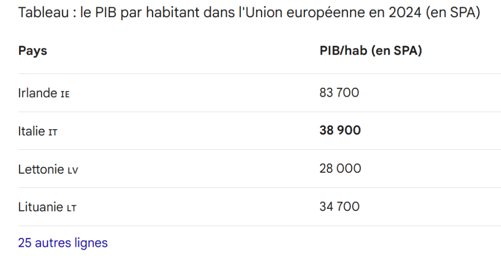 - En 2024 (en Standard de Pouvoir d’Achat – SPA): le PIB par habitant de l’Italie était de 38 900 SPA, le plaçant parmi les pays de l’UE.