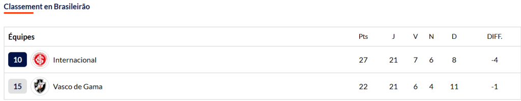 Entre Internacional qui est actuellement 10ème de Serie A avec un bilan total de 7 victoire(s), 6 match(s) nul(s) et 8 revers, et Vasco da Gama classée 15ème de Serie A et présentant un bilan total de 6 succè(s), 4 nul(s) et 11 défaite(s), nous voyons la victoire de Vasco da Gama.