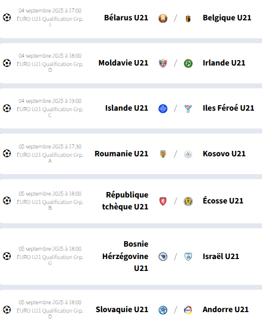 Islande -21 – Iles Féroé -21 est un match de Football de Euro -21. Date et heure du live : 04/09/2025 17:00. Sur notre livescore, vous pouvez suivre l’évolution du score Islande -21 – Iles Féroé -21 en direct et être averti des principales actions de ce match (buts/points/jeux, sanctions, noms des joueurs). A l’issue du match, vous pourrez retrouver tous les moments forts et le résultat de la rencontre Islande -21 – Iles Féroé -21 directement sur cette page.