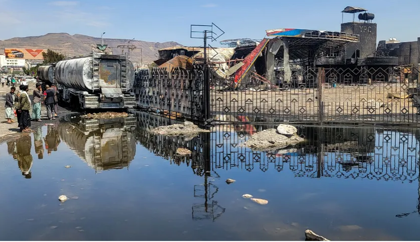 Des Yéménites inspectent les dégâts, dans une installation d’une compagnie pétrolière qui a été touchée par des frappes israéliennes à Sanaa, le 25 août 2025