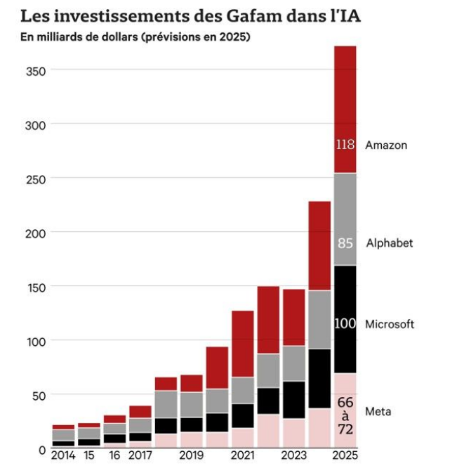 Les géants de la tech dépensent sans compter dans l’IA, au point de transformer l’économie américaine. Pendant l’année 2025, ces groupes (Meta, Alphabet, Microsoft, Amazon et Apple) prévoient de dépenser jusqu’à 400 milliards de dollars, principalement pour construire des centres de données spécialisés dans l’IA. Leurs investissements augmentent, même si leurs revenus liés à l’IA sont encore incertains.