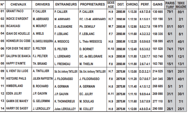Disqualifié(s) : 1 – 3 – 4 – 7 – 9 – 13 – 14 Alors que la majorité des favoris se sont montrés indélicats, c’est la valeur sûre Lexie de Banville (15), qui s’offre ce Prix de Vincennes 2024.
