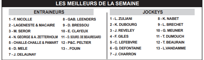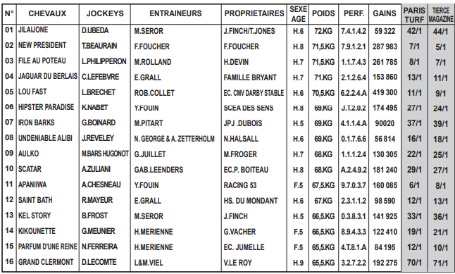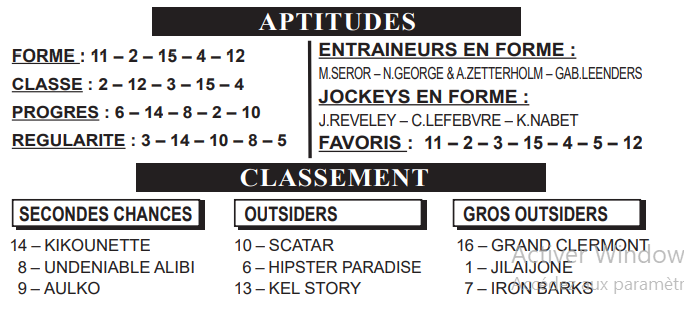 Après une réapparition nécessaire dans le relevé Prix de Compiègne (Gr.3), APANIIWA (11) s’est essayée à Compiègne, dont le profil ne lui plaît pas. Elle retrouve une catégorie et un parcours qu’elle apprécie, avec une valeur revue à la baisse. Performante en terrain profond, elle peut mettre tout le monde d’accord à une cote intéressante. NEW PRESIDENT (2) évoluait sur une piste trop rapide pour ses aptitudes lors de sa rentrée (7e) et devrait faire beaucoup mieux cette fois-ci, d’autant que son mentor l’annonce au top. FILE AU POTEAU (3), meilleur que jamais, PARFUM D’UNE REINE (15), plaisante en dernier lieu, et JAGUAR DU BERLAIS (4), un rentrant de classe, sont autant de belles possibilités pour le podium. LOU FAST (5) n’a plus à faire ses preuves dans cette catégorie, mais il n’a jamais pu convaincre sur ce parcours. Malgré tout, il doit être retenu pour les places, tout comme SAINT BATH (12), redoutable sur les pistes pénibles, et KIKOUNETTE (14), munie de peaux de mouton cette fois.