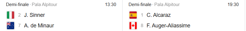 La seconde demi-finale opposera Carlos Alcaraz, premier du groupe Jimmy Connors, à Félix Auger-Aliassime, deuxième du groupe dominé par Sinner. Comme l’Italien, Alcaraz a également réalisé un sans-faute dans sa poule, s’imposant face à de Minaur, Fritz (en 3 sets) et Lorenzo Musetti.