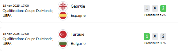 L’Espagne est bien partie pour se qualifier, mais ce n’est pas tout à fait acquis alors que la Turquie a su « suivre » en ayant que 3 unités de retard. Il ne faudrait donc pas se relâcher. Du côté de la Géorgie, la 2e place n’est pas encore impossible, même si ce sera très compliqué. Il faut 2 victoires, pendant que les Turcs s’inclinent deux fois.