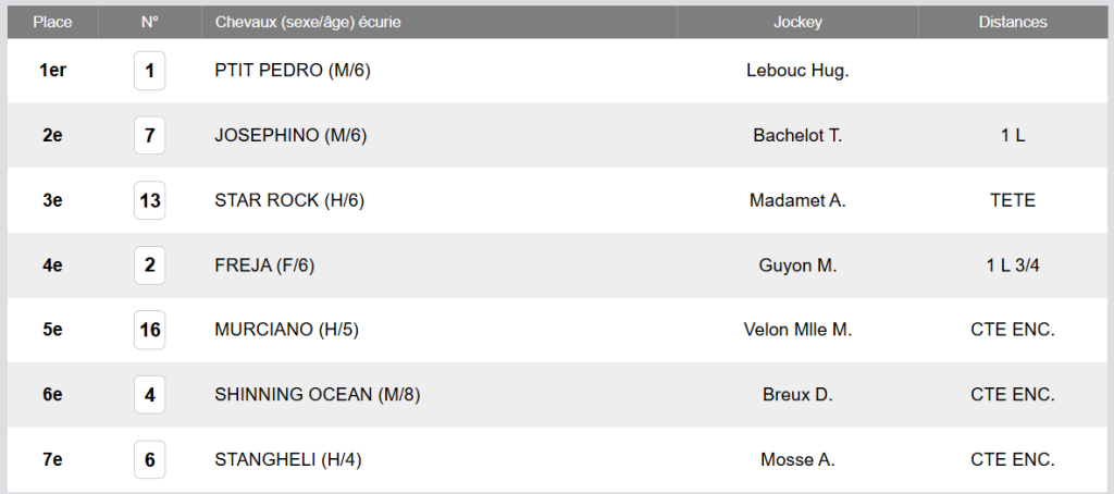 REFERENCE ET PASSE DE LA COURSE Arrivée officielle 2024: 1 – 7 – 13 – 2 – 16 – 4 – 6