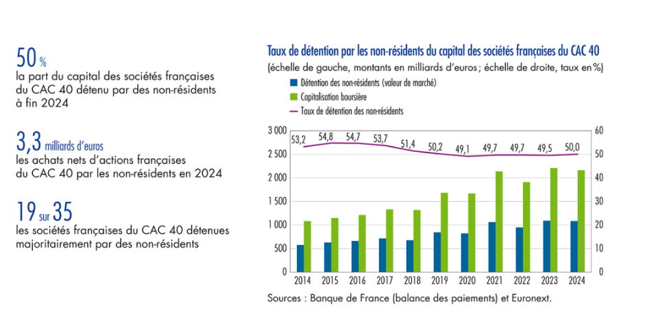 Fin 2024, les non résidents détenaient 1 083 milliards d’euros d’actions des sociétés françaises du CAC 40, sur une capitalisation boursière totale de 2 165 milliards d’euros, soit un taux de détention de 50 %. Cette part est en très légère augmentation (+ 0,5 point de pourcentage) par rapport à 2023.