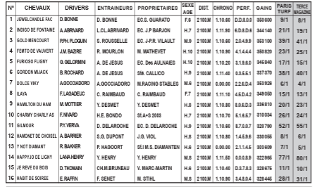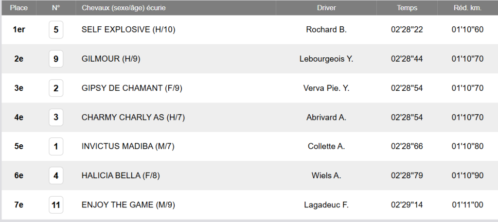 Le n°5 Self Explosive se décale, au début de la ligne d’arrivée, et crée sûrement la décision, en fin de parcours, devançant le n°9 Gilmour, 2ème, en dedans, au passage du poteau, qui précède le n°2 Gipsy de Chamant, à créditer d’une excellente fin de course pour arracher la 3ème place, sur le fil.