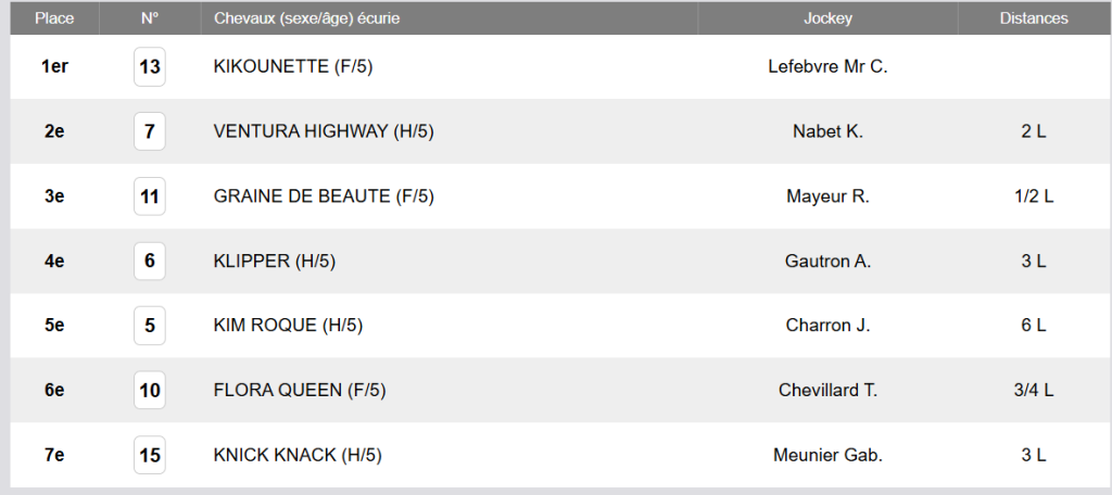 Arrivée officielle : 13 – 7 – 11 – 6 – 5 – 10 – 15