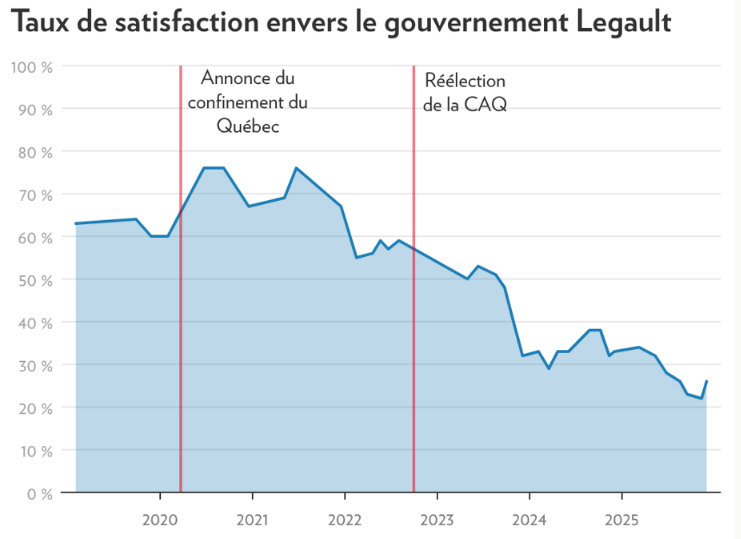 Or, après avoir connu les plus hauts sommets dans les sondages, surtout lors de son premier mandat marqué par la pandémie de COVID-19, la CAQ atteint les bas-fonds. Elle risque même d’être rayée de la carte aux prochaines élections. L’automne dernier, un sondage SOM–La Presse montrait que les trois quarts des Québécois jugent que François Legault devrait partir avant les élections générales de l’automne 2026. Encore mercredi, un coup de sonde de la firme Pallas Data place la CAQ en quatrième position, à égalité avec Québec solidaire et derrière le Parti conservateur du Québec. La CAQ chute à 11 % des intentions de vote, une glissade amorcée dès 2023.
