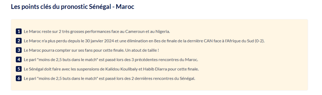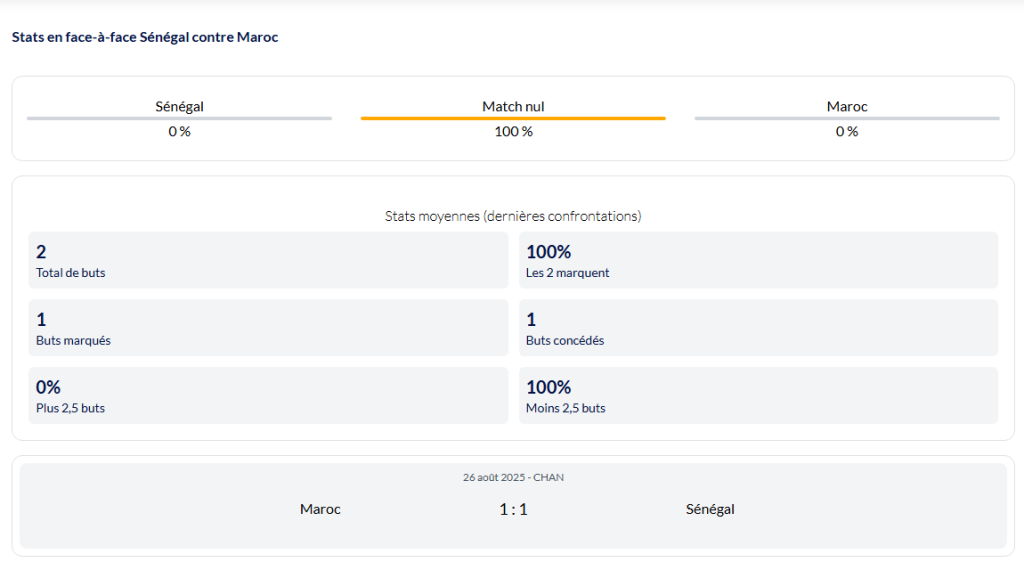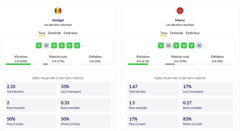 Le pronostic du match entre Sénégal et Maroc est : le Maroc ne perd pas dans le temps réglementaire & moins de 2,5 buts dans le match !