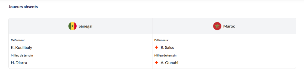 Concernant le Maroc, Azzedine Ounahi est forfait pour cette finale de la CAN 2025. Il pourrait ne pas être le seul absent, puisque Romain Saïss est incertain, lui qui est sorti sur blessure dès le match d’ouverture contre les Comores. Pour le reste, Walid Regragui ne devrait pas avoir le moindre pépin physique.