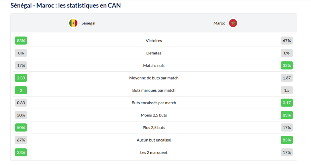 Pour cette finale de rêve de la CAN 2025, difficile de ne pas donner un avantage au Maroc. Les Lions de l’Atlas viennent de faire très forte impression face au Cameroun et au Nigeria, 2 nations qui s’étaient montrées très solides dans ce tournoi. Ils comptent bien poursuivre sur leur lancée et briller durant cette dernière affiche. On ne s’attend d’ailleurs pas à voir beaucoup de buts avec 2 excellentes défenses. Si le Sénégal n’a encaissé que 2 buts jusqu’à maintenant, le Maroc fait encore mieux, avec seulement 1 réalisation concédée.