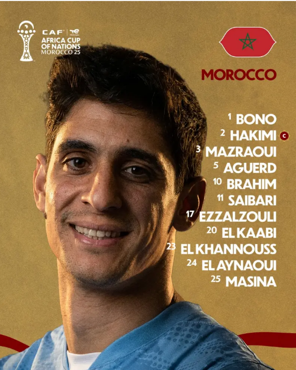Yassine Bono (1), Achraf Hakimi (2), Noussair Mazraoui (3), Nayef Aguerd (5), Diaz Brahim (10), Ismael Saibari (11), Abde Ezzalzouli (17), Youssef El Kaabi (20), Bilal El khannouss (23), Younès El Aynaoui (24), Adam Masina (25).