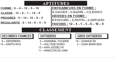 - 11:28:32: Selon le journaliste Kevin Nicolle, le n°6 – HORCHESTRO (FR) a fourni de plaisantes fins de course les dernières fois, et mériterait de décrocher un succès. Avec un bon déroulement, il peut mettre tout le monde d’accord dans ce ZE5 Ordre !