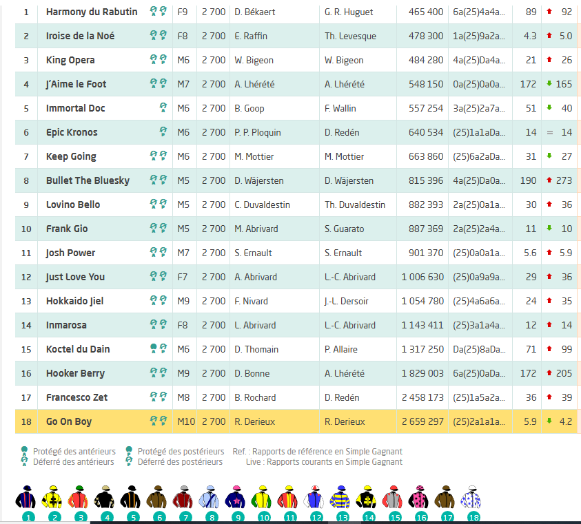 Ce 9 ans, sur la touche un long moment en 2025, a obtenu son ticket pour la Legend Race en se classant 4ème du Prix de Bourgogne Q5. Il ne compte qu’une seule victoire de Groupe I, mais a souvent rivalisé avec les meilleurs à ce niveau de compétition. Son chef d’œuvre reste bien sûr sa 2ème place dans le Prix d’Amérique 2024. Dimanche, il va découvrir la drive de Franck Nivard, quintuple lauréat de cette course. Crédité d’un émoji vert (1). Candidat à prendre très au sérieux.