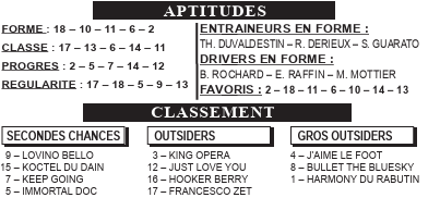 Le champion Idao De Tillard ne sera pas de la partie ce dimanche. L’entraînement de Thierry Duvaldestin sera toutefois représenté ici avec ce 5 ans, double lauréat de Groupe I à Vincennes. Malchanceux (au tirage au sort des places derrière l’autostart, puis sur la piste) dans le Critérium Continental Q3 fin décembre, il a offert dernièrement une très bonne réplique à l’excellente Liza Josselyn. Vainqueur des deux derniers Prix d’Amérique (avec Idao de Tillard), Clément Duvaldestin sera à son sulky à l’occasion de sa première confrontation avec les meilleurs chevaux d’âge du moment. Coup d’éclat possible.