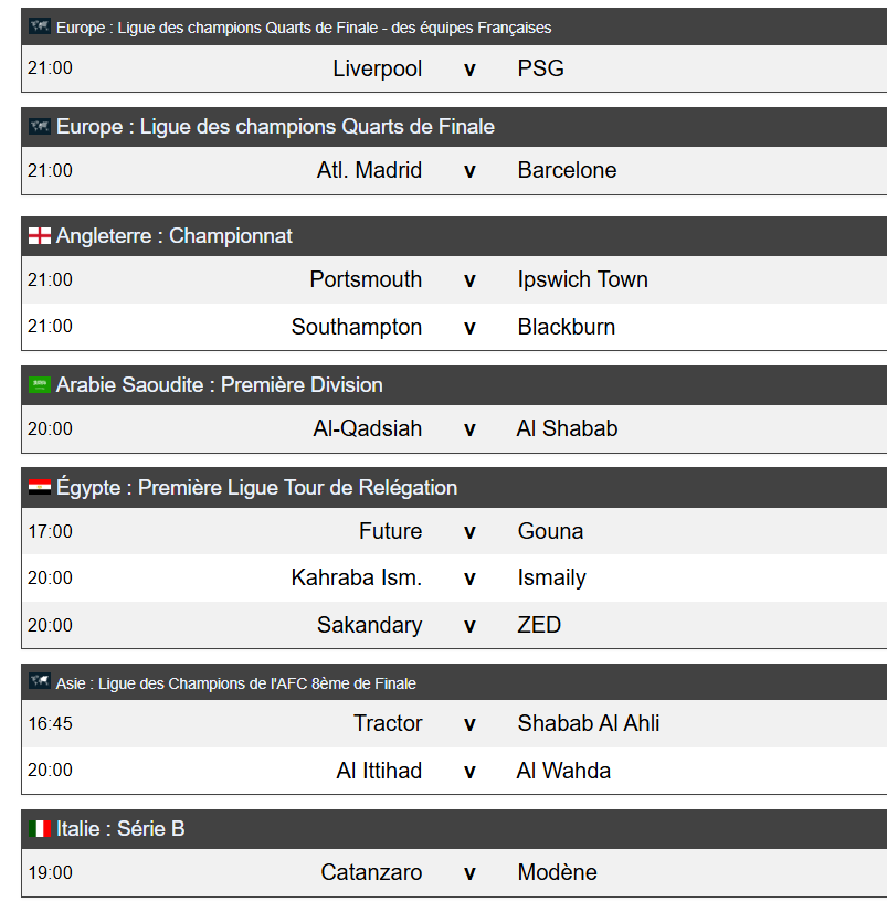 - Liverpool – Paris SG (Mardi 14 avril, 21h) : Le PSG compte sur Désiré Doué et Khvicha Kvaratskhelia, buteurs à l’aller, pour confirmer sa qualification .