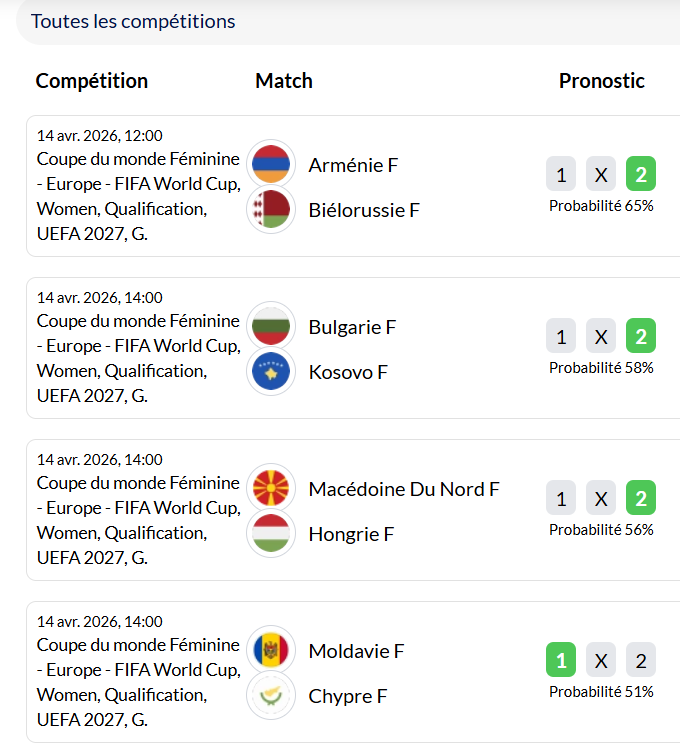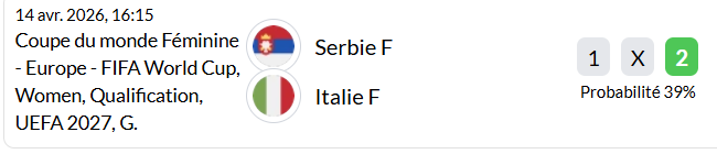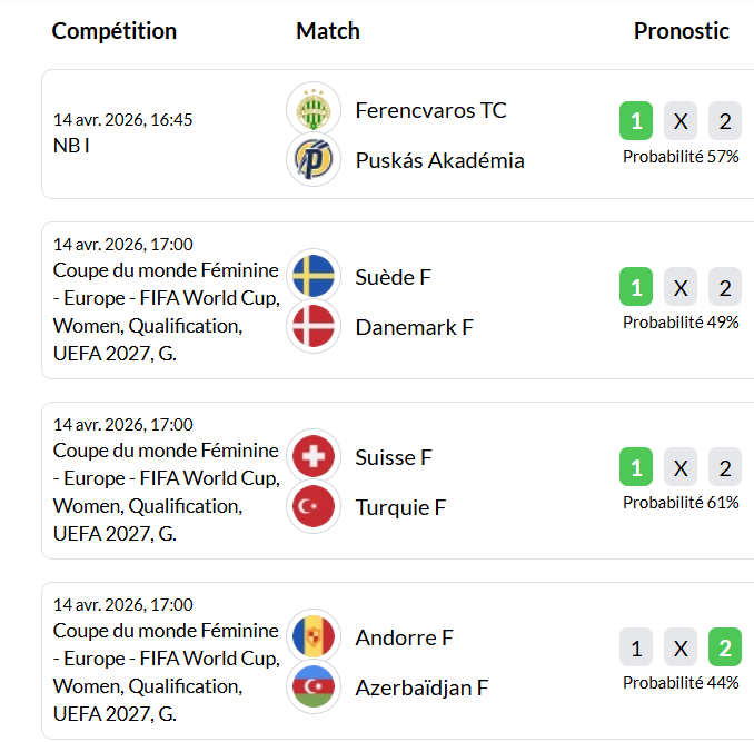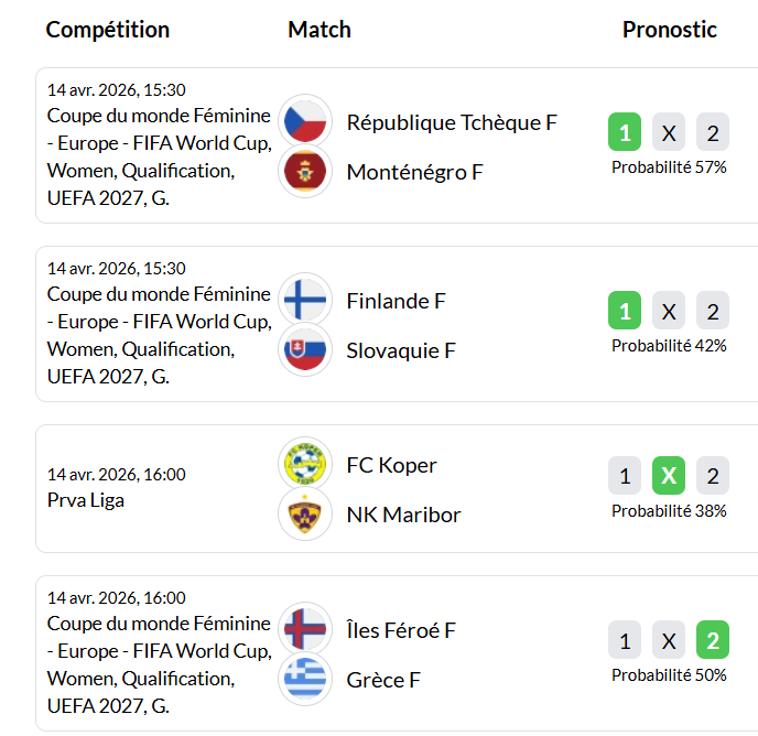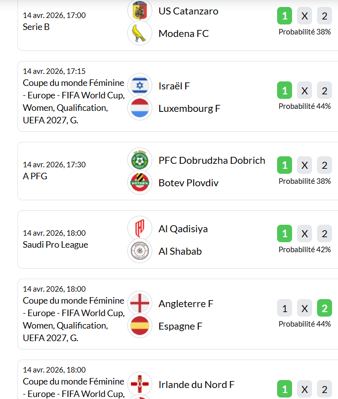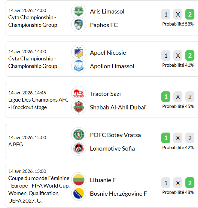 Probabilités selon notre algorithme* des différents pronostics foot 1X2 possibles et meilleures cotes pour le match du 14/04/2026 entre Atlético Madrid et Barcelone en Ligue Des Champions :