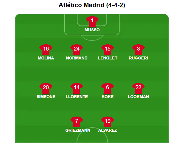Musso – Molina, Le Normand, Lenglet, Ruggeri – Simeone, Llorente, Koke, Lookman – Griezmann (ou Sorlöth), Alvarez.