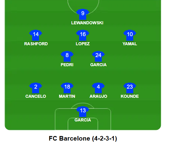 J. Garcia – Koundé, Araujo (ou E. Garcia), Martin, Cancelo – E. Garcia (ou Gavi), Pedri – Yamal, Fermin Lopez (ou Dani Olmo), Rashford – Lewandowski (ou Ferran Torres).