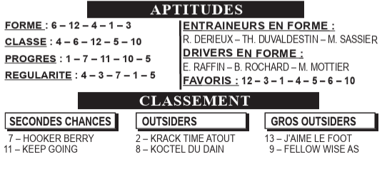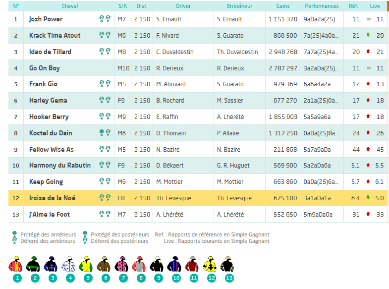 Lauréate du Prix de France en championne, avec déjà un numéro en seconde ligne, IROISE DE LA NOE (12) a depuis réalisé une rentrée encourageante dans le “Kerjacques”, puisqu’elle s’est classée troisième derrière deux hongres de grande qualité. Si tout se passe bien, elle est en mesure de remporter le deuxième Groupe 1 de sa carrière. IDAO DE TILLARD (3) évolue sur la montante et a hérité d’un bon numéro derrière la voiture. À la recherche d’une victoire depuis son deuxième sacre dans “l’Amérique”, en 2025, il conduira l’opposition avec les frères JOSH POWER (1), pieds nus contrairement à sa dernière tentative, et GO ON BOY (4), deuxième des éditions 2025 et 2023. FRANK GIO (5), déferré des quatre pieds pour l’occasion et capable de finir fort, garde son mot à dire pour le podium. Nouvelles venues à ce niveau, HARLEY GEMA (6) et HARMONY DU RABUTIN (10) vont tenter de confirmer leur deuxième place dans, respectivement, le Grand Critérium de Vitesse de la Côte d’Azur et le Prix de Paris. HOOKER BERRY (7), qui a retrouvé de bonnes sensations, mérite également un certain crédit.
