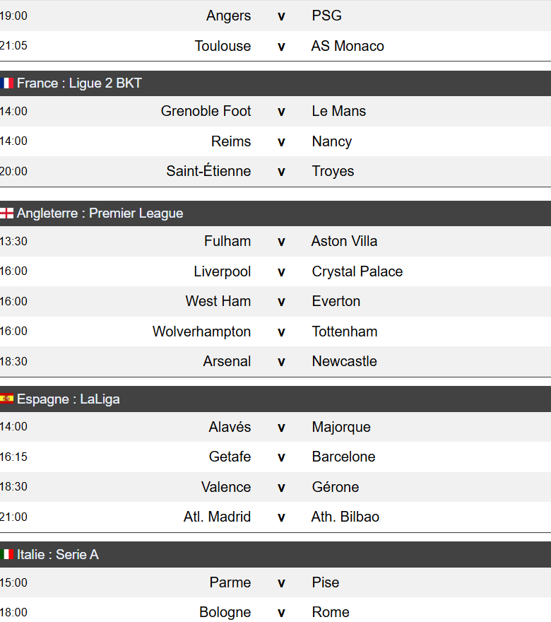 - Ligue 1 (France) : Lyon reçoit l’AJ Auxerre à 15h00. En fin de journée, le PSG se déplace à Angers (19h00) tandis que Monaco affronte Toulouse.