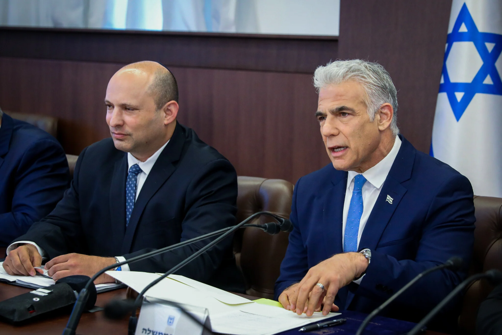 Le Premier ministre Yair Lapid, à droite, et le Premier ministre suppléant Naftali Bennett lors d’une réunion du cabinet, au bureau du Premier ministre, à Jérusalem, le 31 juillet 2022.