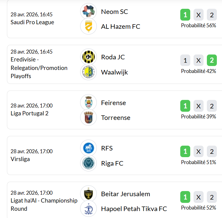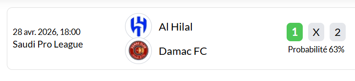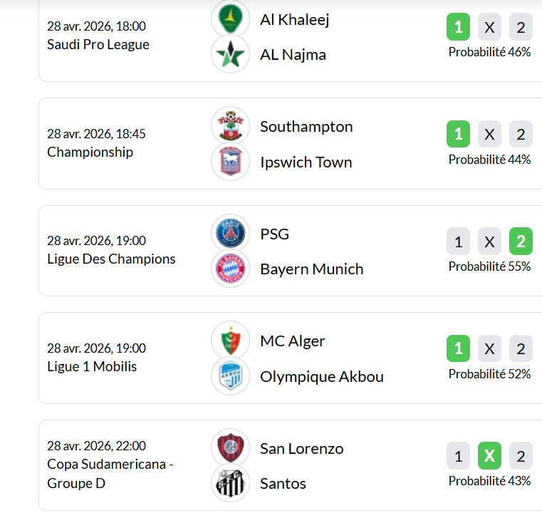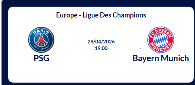 Probabilités selon notre algorithme* des différents pronostics foot 1X2 possibles et meilleures cotes pour le match du 28/04/2026 entre PSG et Bayern Munich en Ligue Des Champions :