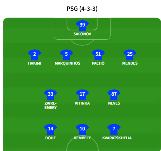 Safonov – Hakimi, Marquinhos, Pacho, Nuno Mendes – Zaire-Emery, Vitinha (ou Ruiz), Neves – Doué (ou Barcola), Dembélé, Kvartskhelia.