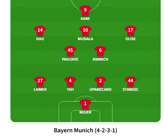 Au Bayern, la pépite locale Lennard Karl (5 buts, 5 passes en Bundesliga et 4 buts, 2 passes en C1) est trop juste pour ce déplacement au Parc. Idem pour le meneur de jeu titulaire Gnabry (8 buts, 4 passes en Bundesliga, 2 buts, 4 passes en C1) qui souffre d’une déchirure musculaire à la cuisse et dont la saison est terminée, et pour le milieu remplaçant Bischof. Ce week-end, c’est le latéral gauche remplaçant Guerreiro (ex-Lorient, Dortmund) qui a rejoint l’infirmerie. En plus, le coach munichois Vincent Kompany est suspendu pour cette rencontre, ce qui veut dire qu’il sera séparé de ses joueurs dès l’arrivée au stade, et qu’il sera interdit de vestiaire et de téléphone. Le Bayern bénéficiera quand même d’un groupe aux qualités très nombreuses. On retrouvera sans doute dans le 11 de départ les excellents ailiers Luis Diaz (15 buts, 11 passes en Bundesliga, 6 buts et 3 passes en C1) et Olise (13 buts, 19 passes en Bundesliga, 4 buts et 5 passes en C1) qui ont brillé face au Real Madrid lors du tour précédent. Au milieu, le duo Kimmich – Pavlovic impressionne lui aussi. Enfin, en pointe, Harry Kane devrait bien sûr conserver la confiance de son coach, lui qui affiche des statistiques démentielles avec 53 buts marqués toutes compétitions confondues cette saison (33 en Bundesliga et 12 en C1 notamment). Pas de très gros avantage sur le papier